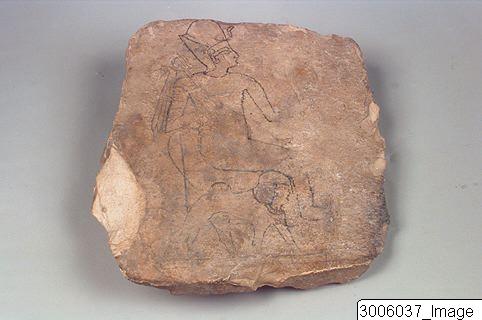 Ostrakon, jämt formade kanter med några trasiga bitar. Skiss på en sida i svart. Den visar en kung, sittades på en bärstol, vänd åt höger. Kungen bär en blå krona med en uraeus. I hans högra hand finn...