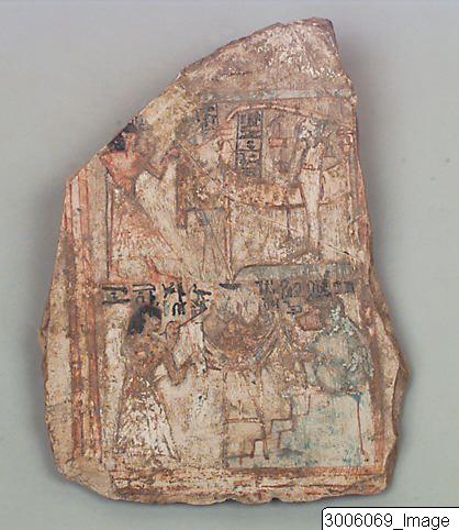 Ostrakon, oregelbundet formad. Skiss på den ena sidan i rött, gult, blått och vitt. Den är uppdelad i två separata sektioner som är omgivna av en ram i gult och rött. I den övre sektionen, till vänster, vänd åt höger, finns en stående man med sina armar upphöjda. Hans kropp och ansikte är färgade röda, peruken är svart. Han bär en veckad kjol. Till höger om mannen finns ett bord, på en pelare, färgat blått. Det är inte möjligt att urskilja vad som en gång fanns på bordet. Ovanför det, och till höger om mannens huvud finns en inskription i svart. Till höger i denna sektion står en gud vänd åt vänster. Det finns två pelare med en girland emellan dem. Gudens överkropp är gul, huvudbonaden är blå och skägget är rött. Han håller i en stav och ett djed(?)-tecken. Denne gud är Ptah, ståendes på en plattform formad som ett Maat-tecken. I den nedre sektionen finns också en man, stående till vänster, vänd åt höger. Kroppen och ansiktet är rödfärgat, peruken svart och den veckade kjolen som han bär är vit. I den högra handen håller han en pensel, den den vänstra en gul palett. På bordet finns objekt i blått och rött som inte kan urskiljas. Dessa är offer till guden som sitter till höger på ett podium, kroppen är blåfärgad, ansiktet rött. Den håller en palett i ena tassen. Det här är Thoth.
