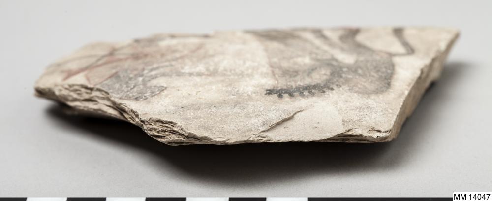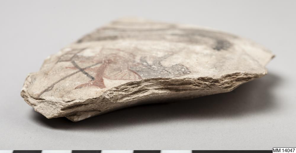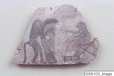 • Ostrakon, oregelbundet formad. Skiss på ena sidan i svart och rött, skadad. Den visar en apa som står till vänster och spelar på en harpa inför en mus som sitter till höger och är vänd mot apan. Apan ... Visa hela
