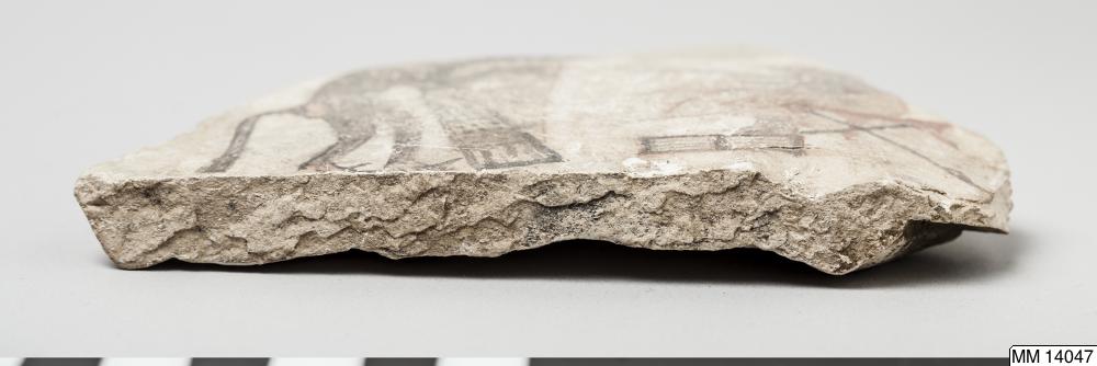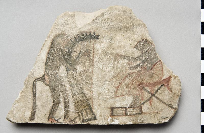• Ostracon, irregularly shaped. Sketch on one side in black and red, damaged. It shows a monkey, standing on the left, playing the harp to a mouse, sitting on the right and facing the monkey. The monkey is facing right, outlined in red and then coloured in black, with some parts of the fur highlighted through a darker colouring. Face, behind and feet are all coloured red. The harp is black, with red... Visa hela