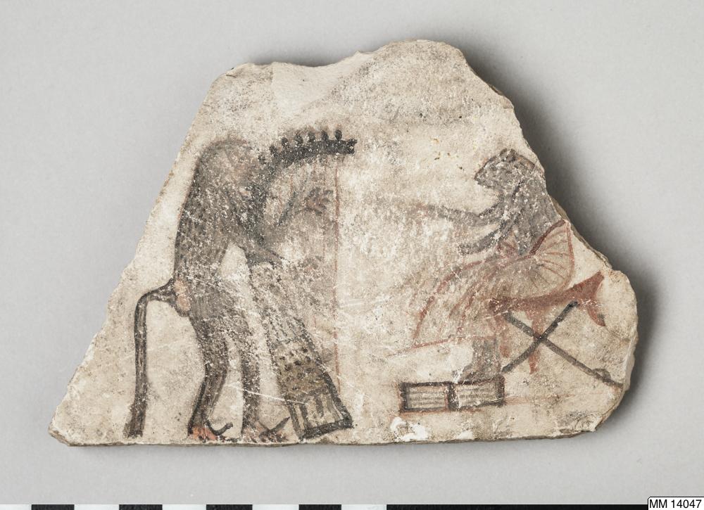 • Ostraka. 1300-1100 f.Kr. Apa spelar harpa för en mus.