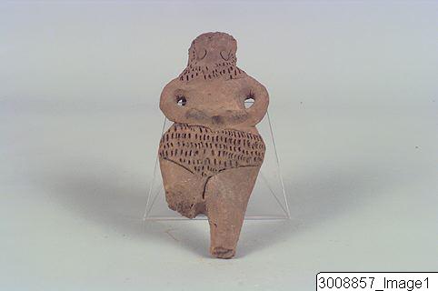 Figurine of a standing woman. Long hair spilling down over the shoulders. Large, circular eyes placed very low in the face. Hands holding breasts? The genitals are marked by impressed dots. Legs marked by a single, incised line.