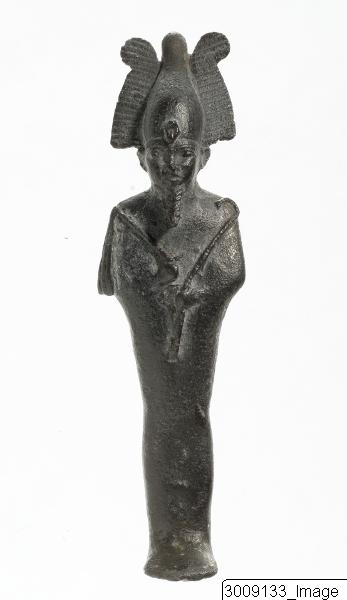 En Osiris-statyett, skägget är delvis förbundet med bröstet via en kort brygga, krumstaven i vänsterhanden, gisslet i högerhanden, bärandes atefkronan med uraeus. Tidigare monterad på en träsockel, nu separerad.