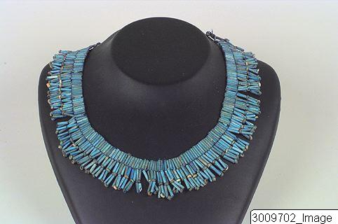 Halsband bestående av en övre sträng av vertikalt placerade cylindriska pärlor. På detta är fastsatta andra vertikalt placerade cylindriska pärlor tillsammans med ringformade pärlor. Monterad på textiltråd.