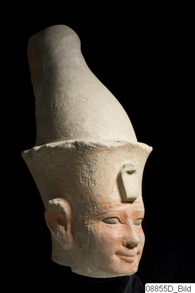 Sandstone head depicting Sesostris I wearing the double crown for Upper and Lower Egypt. On his forehead he has a rearing cobra, a so called uraeus that was a symbol for royal power. The statue is said to originate from the Karnak temple at Thebes. Like several other statues depicting Sesostris I, it may have been repainted and reused by later kings. This statue head was received as a gift from the Egyptian government in 1972 as an acknowledgement for the efforts of Sweden in the international Nubian campaign.