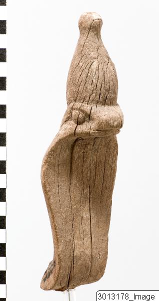 The raised cobra, so called uraeus, symbolises royal power and can often be seen on the forehead of royal statues. This wooden cobra wears the white crown of Upper Egypt and has probably decorated a shrine or a coffin.