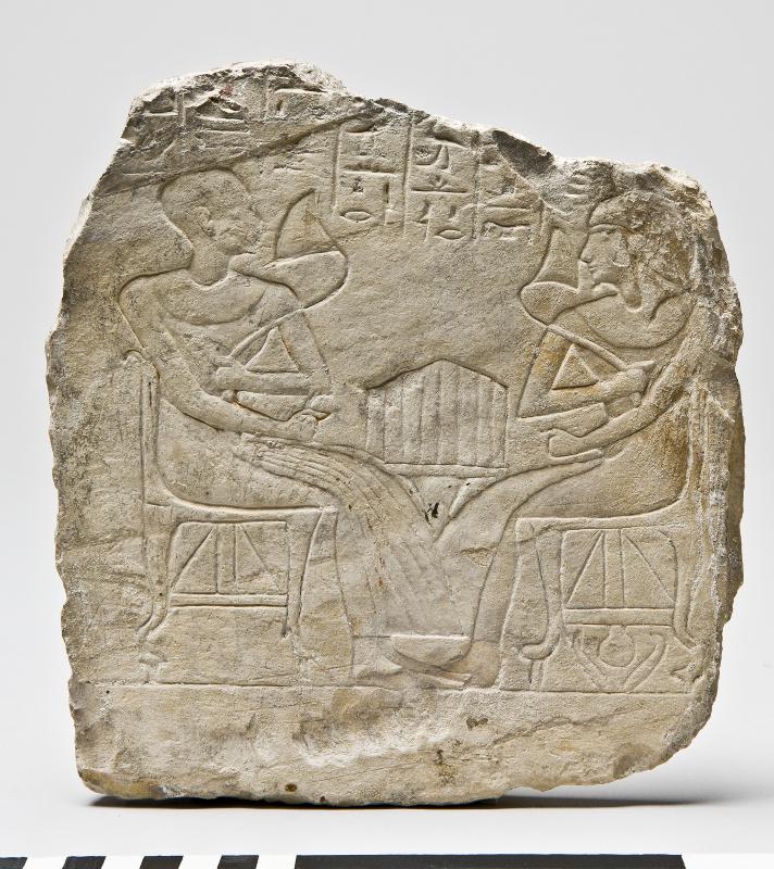 • Del av en stele med en man och en kvinna som sitter på varsin sida om ett offerbord.