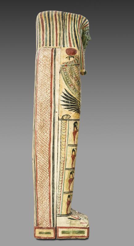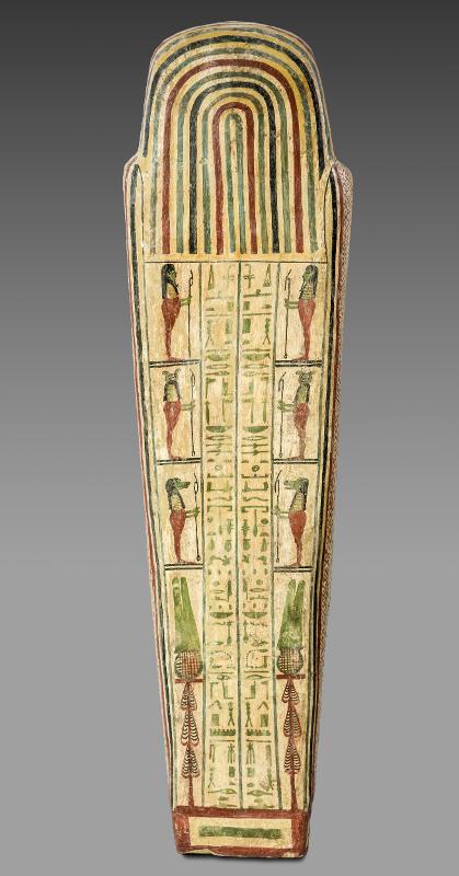 Mummy coffin for the man Hapimen. Anthropoid coffin, decorated in polychrome, representing the deceased wearing a tripartite wig, a plaited ‘divine’ beard, and with a broad collar, with solar raptor terminals upon its chest. The face and beard are coloured green, which is also used extensively in the artist’s palette elsewhere on the coffin. A kneeling figure of Nut, facing left, is below the collar, her solar disk being superposed over the collar. Below her, the front of the lid is divided vertically by a column of text, running to the toes, with flanking sections divided into four registers, each with an image and a column of text, the latter being a label-text in the first two registers, relating to the deceased in the second pair. The images are as follows: R.I Human-headed Imseti. L.I Ape-headed Hapy. R.II Canid?-headed Duamutef. L.II Raptor-headed Qebehsenuef. R.III Ram-headed deity. L.III Bovid-headed deity. R.IV Crocodile-headed deity. L.IV Cobra-headed deity. The upper surface of the feet has a pair of recumbent canids on shrines; there is a low podium beneath the feet. The sides of the lid each have a snake, running from the ankles to just below the wings of Nut. The lid was fixed to the trough by three tongues on each side of the fitting into corresponding slots in the trough. The trough is decorated with a lozenge pattern, probably imitating a bead net.