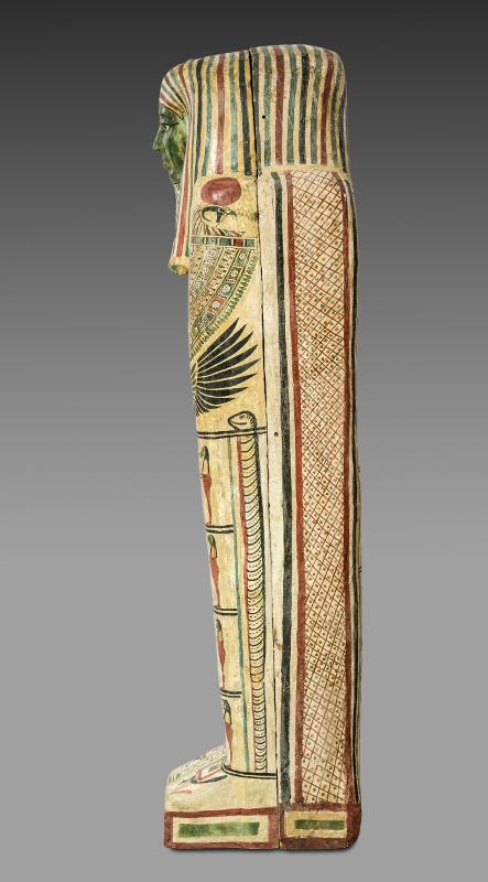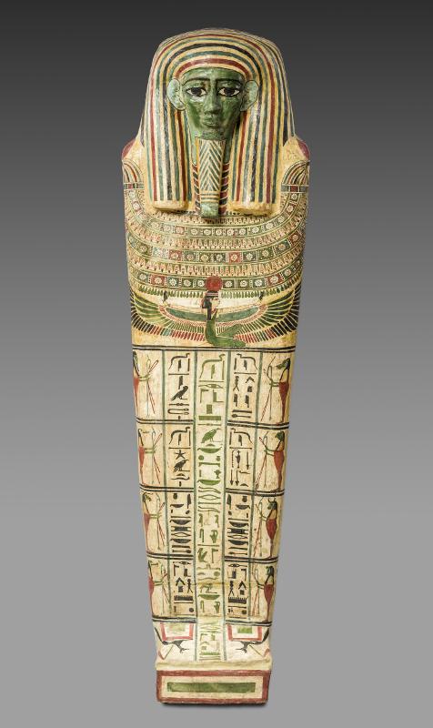 Wooden coffin belonging to Hapimen, son of Kemerek. The green face recalls rebirth and rejuvenation. Below Hapimen’s collar is a seated figure of the goddess Nut who spreads her wings across the coffin. The coffin comes from Memphis and is dated to the Late Period or early Ptolemaic Period.