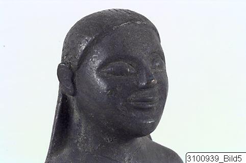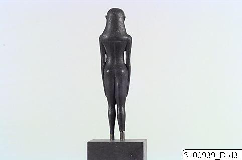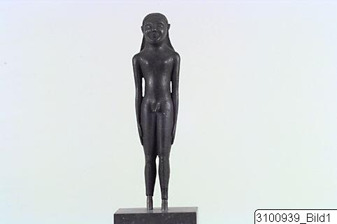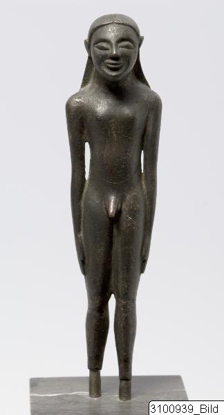 Naked, male figure; he stands frontally, with the left foot slightly in front of the other and the arms close to his body; the head is rounded with a protruding chin, almond shaped eyes and smiling mouth; the long hair falls down on the back, the strands of hair indicated by incised lines; incised lines on the body indicate the collar-bones, the muscles of the chest, the rounding of the belly and ...