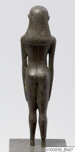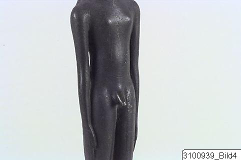 Naked, male figure; he stands frontally, with the left foot slightly in front of the other and the arms close to his body; the head is rounded with a protruding chin, almond shaped eyes and smiling mouth; the long hair falls down on the back, the strands of hair indicated by incised lines; incised lines on the body indicate the collar-bones, the muscles of the chest, the rounding of the belly and the knees.