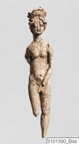 Nude woman standing; carved with great plasticity from three assembled fragments of ivory; her head is turned to left; she wears a diadem and the hair below it appears to be drawn and tied to the back; long neck; the face, breasts and belly are clearly marked; the left hand covers her sex; weight is on the left leg, causing a relaxed pose; the back is also well executed with plasticity.