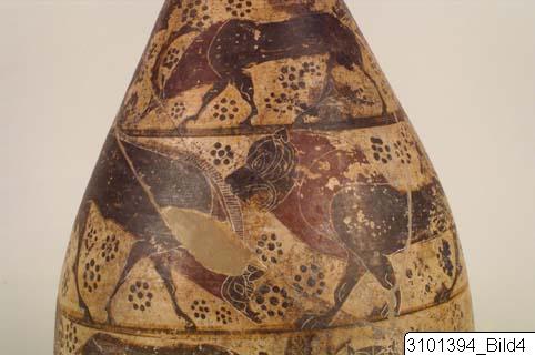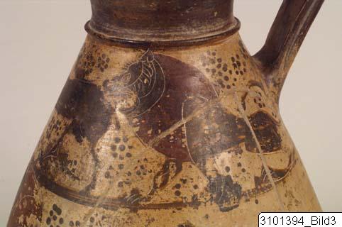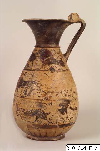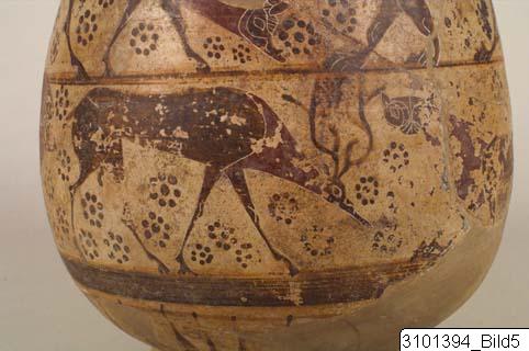 Round mouth with everted rim; concave neck with a ring at its base; ovoid body; ribbed band handle; rotelles on rim, on either side of the handle; bevelled ring base; buff clay, lustrous surface; decoration: the rim, neck and handle is painted brown on the exterior as well as the interiorthe decoration is divided into three friezes depicting animals painted in dark brown and maroon on a light yellowish-brown ground; the frieze below the neck depicts a sfinx turning right, a grazing deer and a roaring lion turning left; the second frieze depicts two wild boar turning right and a lion turning left, a fourth animal (a bird, prob. a swan) is barely visible next to the lion; the third frieze depicts a lion and a grazing deer turning right, a panther turning left and a wild boar turning right; in-between the animals are brown dot-rosettes; on each the rotelle is a similar rosette, but in white paint; the figures in the third frieze stand on a broad brown band below; brown rays shoot up from the base to that same broad band.