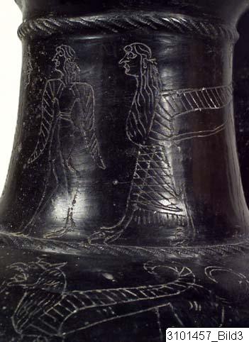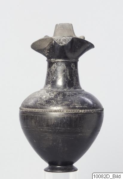 Fine black fabric with glossy surface; plastic and incised decoration; trefoil mouth with sieve; band handle from rim to shoulder; sharp angle between mouth and neck; neck tapering slightly upwards; piriform body; small conical ring base. Incised decoration: a palmette and geometrical pattern on handle; on neck a standing winged figure flanked by two sphinxes; animal frieze on shoulder: griffon an...