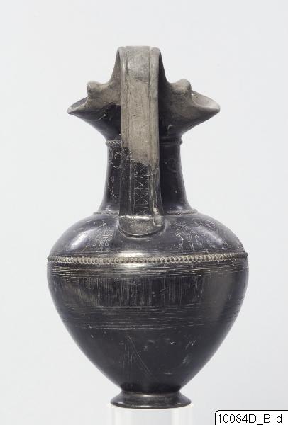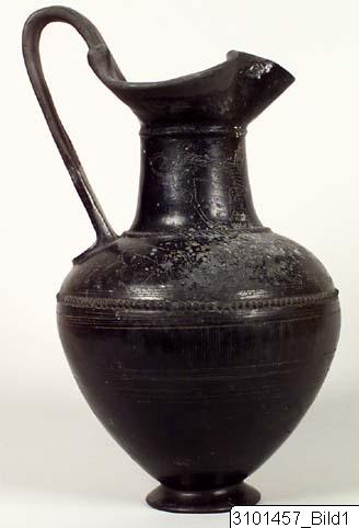 Fine black fabric with glossy surface; plastic and incised decoration; trefoil mouth with sieve; band handle from rim to shoulder; sharp angle between mouth and neck; neck tapering slightly upwards; piriform body; small conical ring base. Incised decoration: a palmette and geometrical pattern on handle; on neck a standing winged figure flanked by two sphinxes; animal frieze on shoulder: griffon and grazing deer antithetically placed with a branch in front of them; a palmette on either side of handle attachment; on body vertical lines between groups of horizontal lines; Etruscan inscription on lower body below which are rays down to the base; mouldings with corded decoration at the junctions between mouth and neck and neck and body.