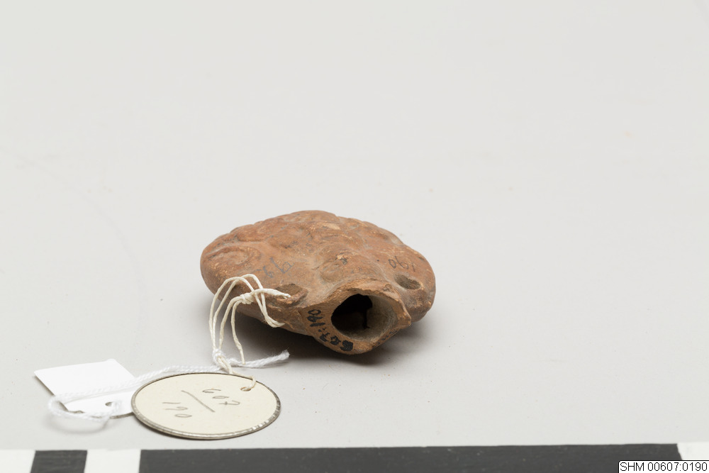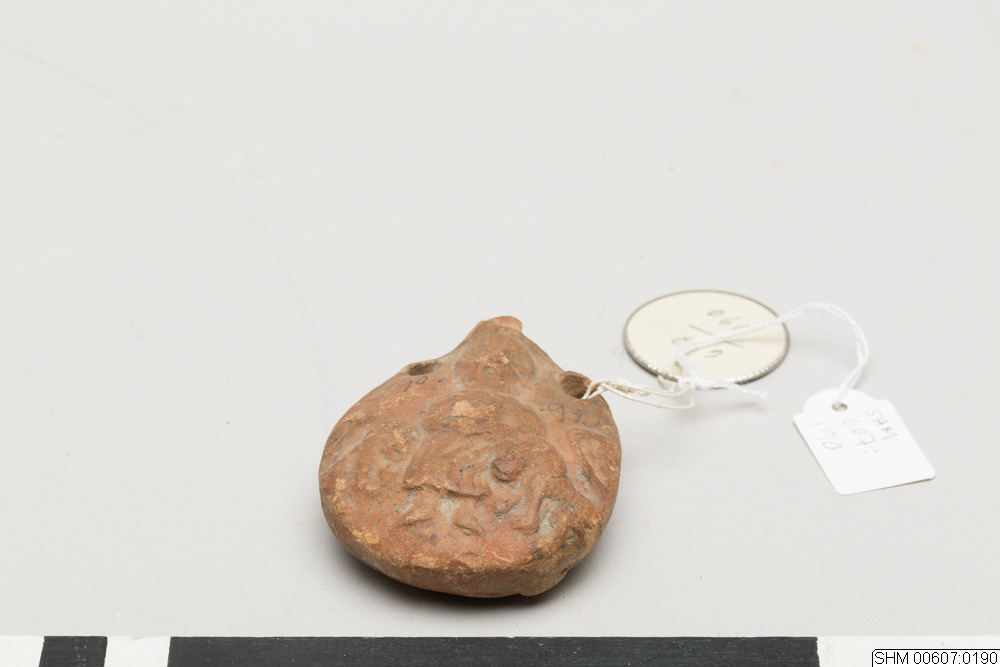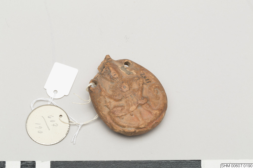 Flattened, ovoid body. Two string-holes below the neck. Decoration in relief: at one side: a man, possibly holding an open book, between two lions; on the other side: a man in armour, standing on a dragon,pointing a spear towards its head. Reddish clay.