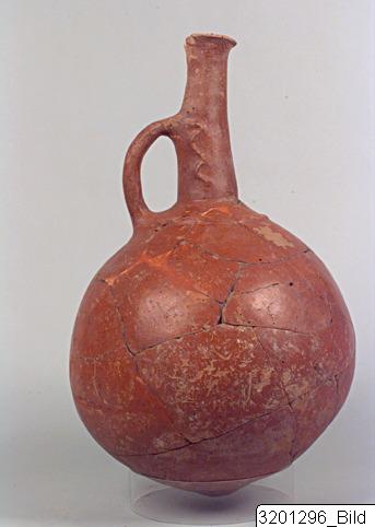 • Pointed base; almost globular body; tall, narrow neck; cut away neck; everted rim; oval handle from cut away to shoulder; pinched horizontal band on shoulder; representation of a snake on either side of neck from neck base to shoulder. Hard light brick clay; lustrous orange red slip.