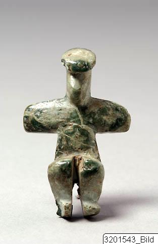 Stylized, female idol in a seated position with bent legs; cruciform body; short outstreched arms; tall neck with projection in front; flat, rounded head; flat back. Chevron carvings on back. Green, polished steatite.