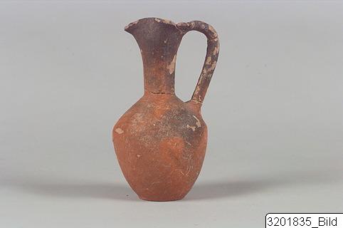 Flat base; oval body with marked shoulder-line; tall, cylindrical neck, widening upwards; wide, pinched rim; twin-handle from rim to shoulder; knobs on rim on either side of handle. Hard, light-grey clay; lustrous orange-red to dark slip.