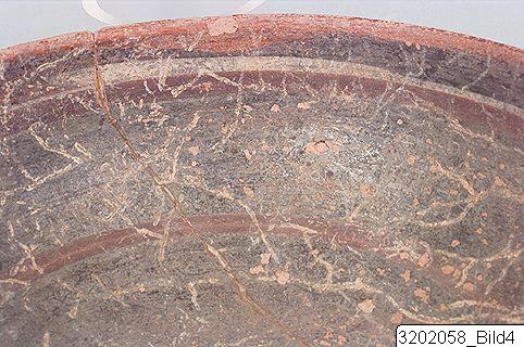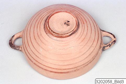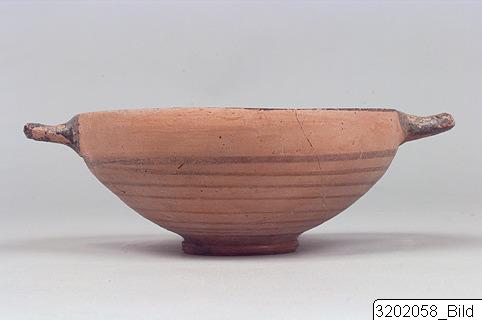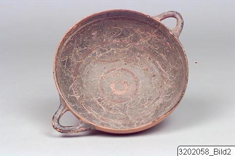 Ring-base; semi-deep body with curved sides; sharp rim; round, horizontal handles just below rim. Hard, pinkish buff clay. Exterior: semi-lustrous, pinkish buff slip; lustrous, light red to dark grey paint. Band encircling base and lower body; lines encircling body and rim; handles painted. Interior: lustrous, dark grey slip; matt, lilac and light buff paint. Lilac and light buff band encircling upper body; lilac band encircling mid-body; lilac, concentric circles on bottom.
