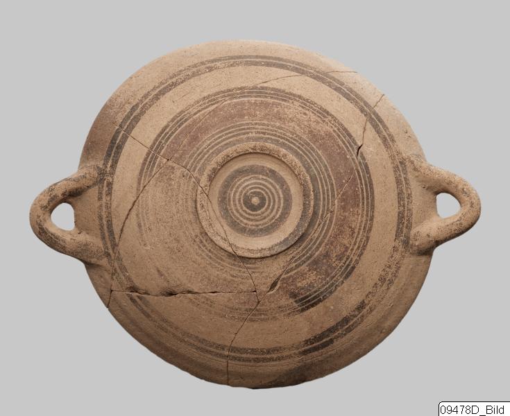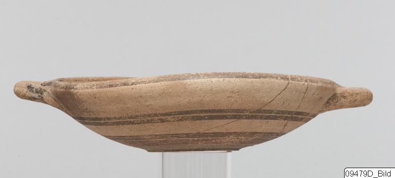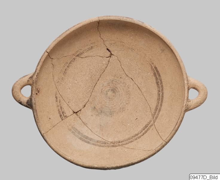 Ring-base; wide, rather shallow body; plain rim; round horizontal handles at rim. Hard, buff clay; matt, buff slip; matt, dark red and dark grey paint. Exterior: grey spiral on base; red band bordered by grey lines encircling lower body; two grey parallel lines encircling upper body; rim and handles painted grey. Interior: two parallel lines encircling mid-body; grey spiral on bottom.