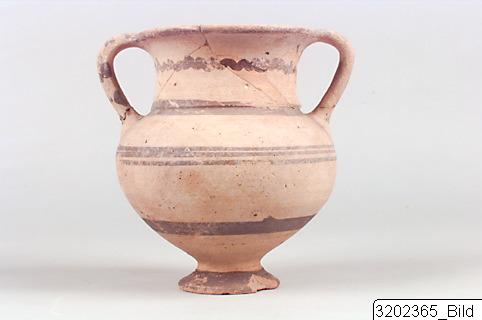 Conical base with conical cavity underneath; ovoid body; concave neck; wide, horizontal rim; flat handles from rim to shoulder. Hard, light buff clay; matt, light buff slip; matt, dark grey paint. Base painted; band encircling lower body; lines encircling upper body; band encircling neck-base; wavy band encircling mid-neck; lines encircling rim; band encircling inside neck; horizontal strokes on handle.