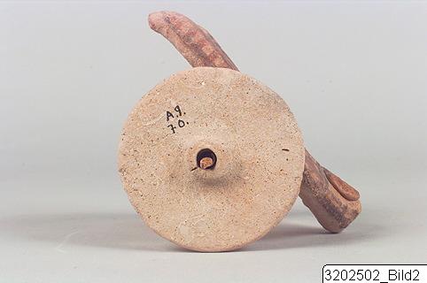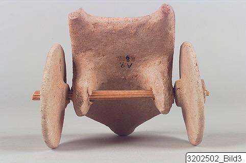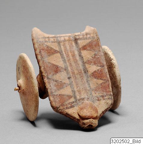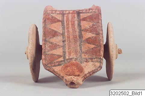 Terracotta chariot with two solid wheels; flat, horizontal base with two knobs turned downwards at the back corners; in central front side a hole for fixing the pole; above this hole a horizontal disc-shaped plaque; upper part of chariot decorated with central, parallel red and black lines framed by two bands of black-bordered red triangles; this decoration and the edge of chariot bordered by black lines with red transverse strokes in between; sides of chariot decorated with red crossed lines.