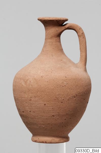 Raised, flat base; oval body with depressed shoulder; tall, narrow concave neck; thick, flat rim; handle from upper neck to shoulder. Hard, buff clay; matt brownish buff slip.