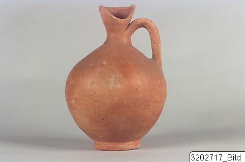 Ring-base; ovoid body; ridge encircling neck-base; wide, funnel-shaped mouth; concave, raised handle from neck-base to shoulder. Hard, pinkish buff clay; semi-lustrous, light orange slip.