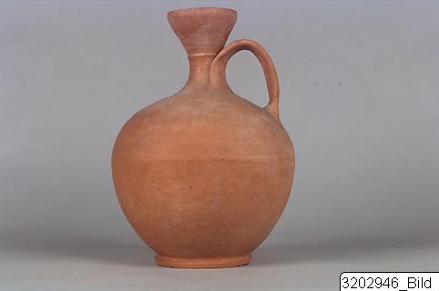 • Ring-base; ovoid body; ridge encircling shoulder; short, narrow, concave neck; ridge encircling upper neck; wide, funnel-shaped mouth; concave, raised handle from neck-base to shoulder. Hard, light buff clay; semi-lustrous, light buff to light orange slip.