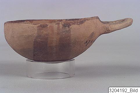 Round base; shallow body; slightly sharp rim; raised, horizontal, oval handle just below rim. Hard, pinkish buff clay; semi-lustrous, pinkish buff slip; matt, dark red and dark grey paint. Red wavy bands, framed by grey straight bands, from rim down to base, on both sides; rim and handle painted grey.