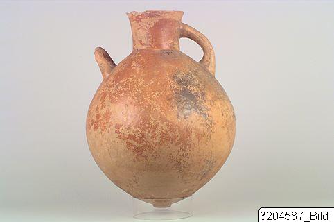 • Small circular base-knob; oval body; short, concave neck; oval handle from mid-neck to shoulder; horizontal handle on shoulder opposite vertical handle. Hard, brownish buff clay; lustrous brownish to orange red slip.