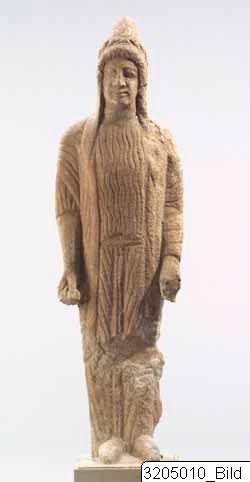 • Plank-shaped statuette; feet almost isolinear, but diverging; arms slightly advanced, with small votive objects in the hands. Broad chin, lips with faint smile, eyes of myrtle-leaf shape, straight nose in line with forehead, thick mass of hair in front with latticed incisions, conical hair-dress, covered by a veil and surrounded by a wreath. Long chiton with overfold and sleeves ending at elbows, ... Visa hela