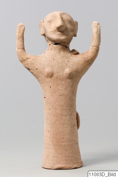 • Statuette with trumpet-shaped, hollow body. Female pellet breasts. Concave neck, square head and broad chin with rounded beard. Mouth with painted lips. Convex nose with thick end. Eyes, lids and beard painted black. Ridged eyebrows. Large, plain ears. No forehead. Arms uplifted. Snake curling along the back of the figurine and projecting above left shoulder. Black lines around upper end of arms a... Visa hela