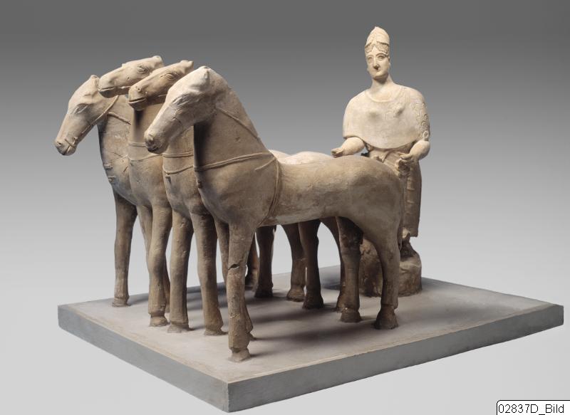 Function: Statuette of Athena wearing the aegis and a Corinthian helmet, mounting a chariot drawn by four horses. Horses are naturalistically rendered, but heavily restored. Chariot wheels not preserved. The composition was mounted on a platform, which is not preserved. Acquisition: Excavated at Mersinaki in north-western Cyprus by the Swedish Cyprus Expedition (1927-1931). Acquired by the Cyprus Collections, subsequently the Museum of Mediterranean and Near Eastern Antiquities, Stockholm in 1931 when the finds from Cyprus were brought to Sweden and the museum set up. Why this is a masterpiece This is a unique composition in the Coroplastic Art of the period. The cult of Athena was widespread in Cyprus during the fifth century BC and this object is indicative of the strong cultural ties with Greece. History of the Object Excavated in the sacred area of Mersinaki, located half way between Soloi and Vouni near the north coast of Cyprus. (Virtual Collection of Masterpieces, http://masterpieces.asemus.museum/Default.aspx)