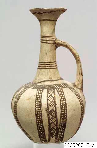 Globular body, tall, narrow neck, funnel rim, flat handle from neck to shoulder, slightly convex base. Fine, gray clay; smooth cream slip; dark brown matt paint. Vertical rows of ladder pattern and bands of hatched lozenges in their interstices on body. Ladder pattern encircling upper body at handle hight. Uneven line encircling neck-base. Four parallel lines encircling lower neck and mid-neck at handle hight. Line encircling upper neck. Wavy line on outside of rim. Four groups of four short, vertical, parallel lines on inside of rim. Lines encircling abutments of handle. Two wavy lines on outside of handle.