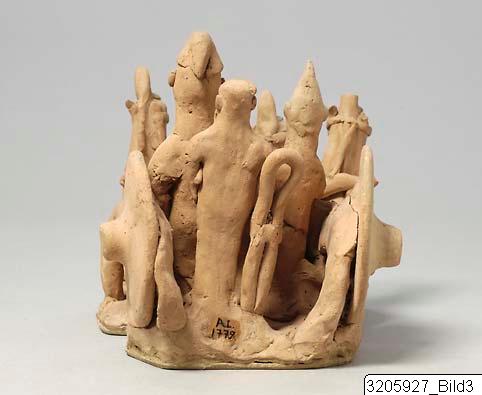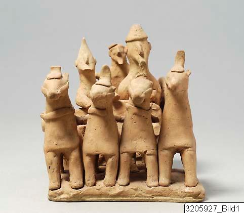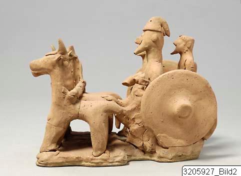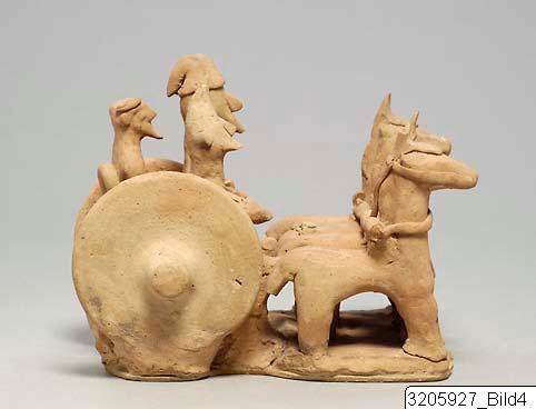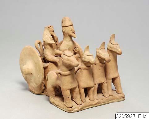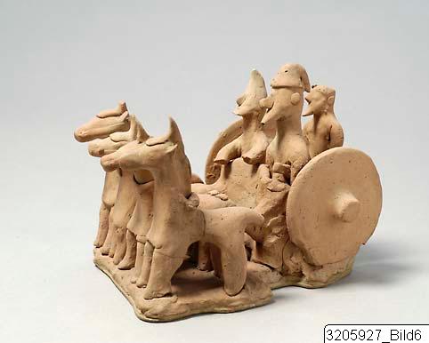 Chariot drawn by four horses with very short bodies. Straight necks, hogged manes, front-cover, head-cover with plume, cheek-bands, yoke laid across necks of horses which are yoked two and two. The chariot is low and of flat type attached to the horses by means of two poles. The chariot has big, solid wheels. The chariot body is open in the rear and there is a loop. In the chariot three men are standing. The right one in front is the driver, he has straight-cut beard and pellet ears, dressed in a pointed helmet with top bent forwards. The left one in front has a pointed beard and pellet nose, and is dressed in a soft helmet with top bent backwards. He holds a sword between body and left arm. The man standing behind the last described has pointed beard, pellet ears, and is dressed in a turban. On left shoulder fragment of a strap which indicates that he has been holdning a sword, now missing. The group stands on a base-tablet. Brown clay, light slip, rather effaced.