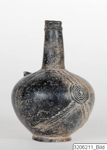 Narrow, tapering neck. Depressed, ovoid body. Base-ring. Relief decoration: Two ridges encircling upper neck. Three vertical ridges in front from neck-base to mid-body, where attached to a spiral. Two vertical rows of parallel oblique bands (rope patterns). On body also two opposed rows of two parallel vertical lines from neck-base to lower body. Grey clay. Black lustrous slip.