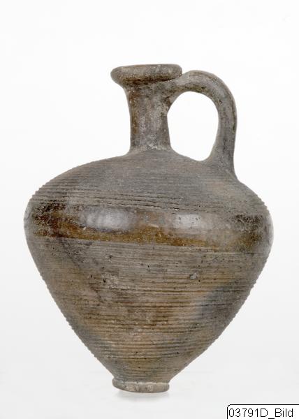 Funnel-shaped mouth; ring rim; narrow, concave neck. Ovoid-biconical body with button-base. Oval handle from below rim to shoulder. Blackish-brown clay. Decoration: Incised horizontal lines encircling the whole body, except for an undecorated band around the middle of the body.