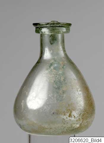 Small free blown jug. The rim is profiled, a small neck and a piriform body ending in a flat standing point. The handle of darker green glass is folded towards rim and neck curving to the body where a broader glass thread has been pressed inwards with an instrument creating a stepped decoration. Pale green glass with darker green decoration.