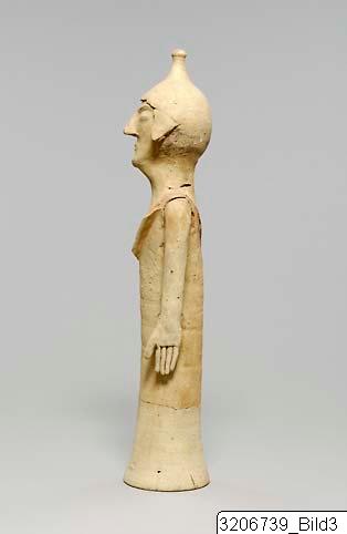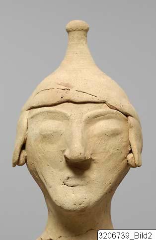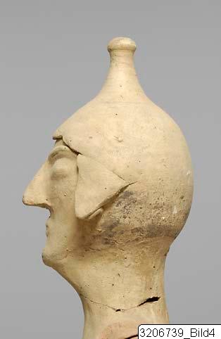 Tall, hollow, cylindrical, wheel-made body. Horizontal shoulders. Left arm vertical along body. Mantle with plain border. Marked, curved eyebrows. Prominent, almond shaped eyes. Prominent, straight nose. Oval mouth. Rounded beard. Pointed helmet with cheek-pieces. Brown-red gritty clay, light slip.