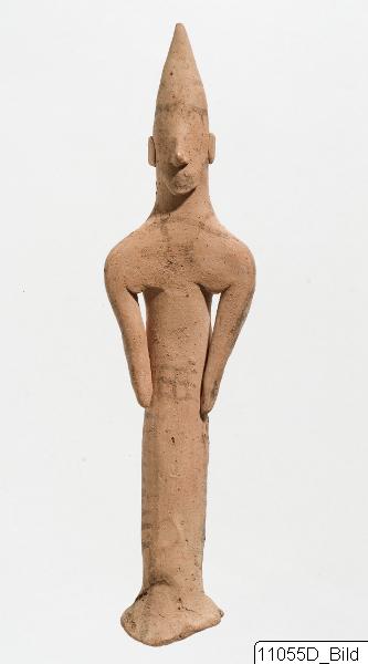 Statuette with solid, cylindrical body. Splayed base. Sloping shoulders. Arms along sides. Hands not shaped. Square head. Pellet ears. Pinched nose with nostrils indicated. Long rounded beard. Tall helmet. Shawl indicated. Black encircling line round helmet crossed by four vertical lines from top of helmet to rim. Rim of helmet is black. Hair is indicated by short black lines encircling head below...