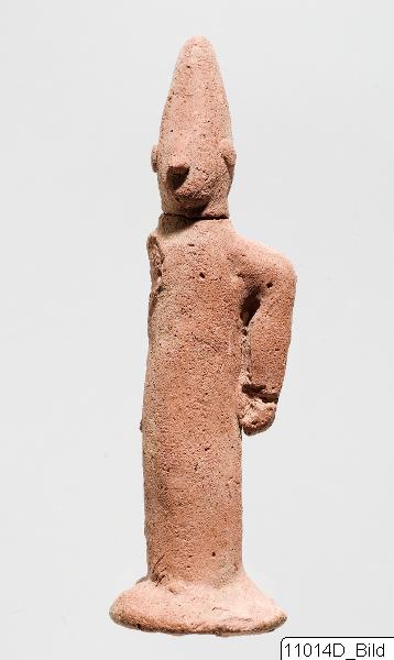Statuette with solid, cylindrical body. Splayed base. Broad, slightly sloping shoulders. Arms along sides. Hands not shaped. Oval head. Pellet ears. Pinched nose. Short beard. Helmet. Red-brown clay. Light-brown slip.