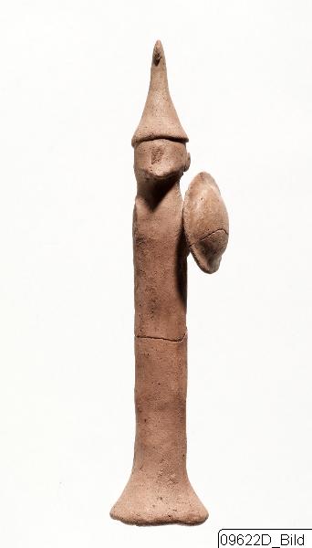 Statuette with solid, cylindrical body. Splayed base. Square head. Pellet ears. Pinched nose. Pointed beard. Narrow helmet with indicated rim and top bent forwards. Left arm carries round, convex shield. Shield handle-straps indicated. Red-brown clay. Reddish slip.