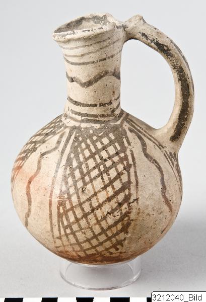 Globular body with round base. Concave neck. Slightly splaying rim. Oblique mouth. Knobbed handle from rim to shoulder. Decoration: Straight and wavy lines around neck. Broad lattice-bands and wavy lines from neck to base. An encircled dot on base and a framed, wavy line on handle. Buff clay.