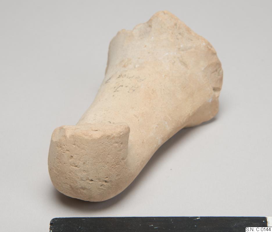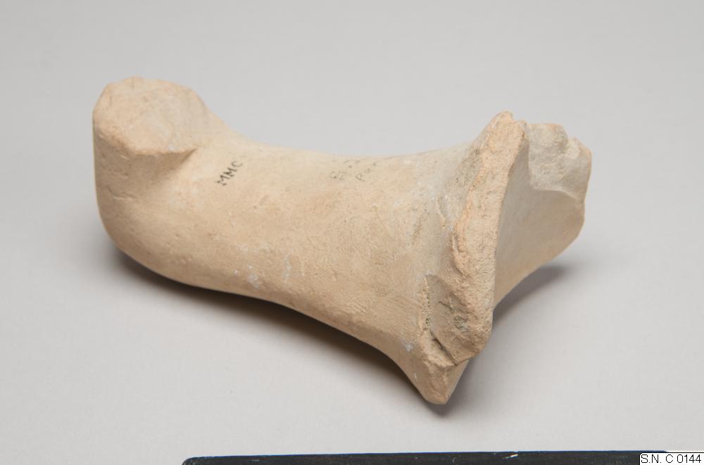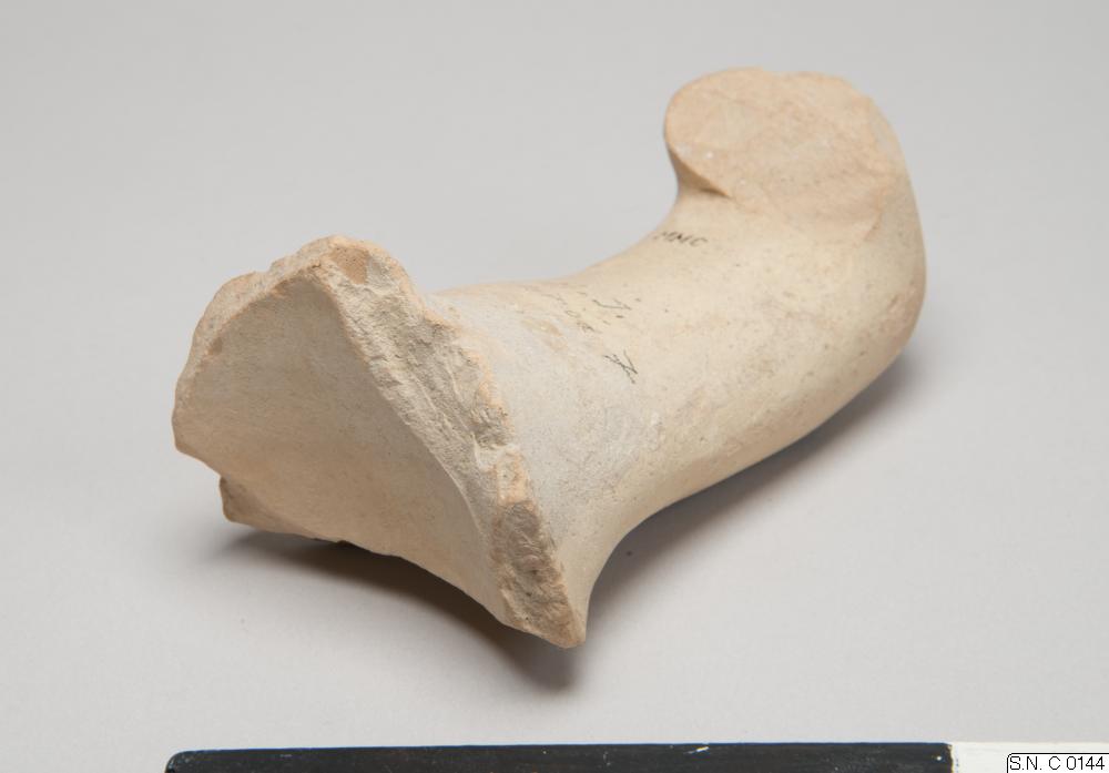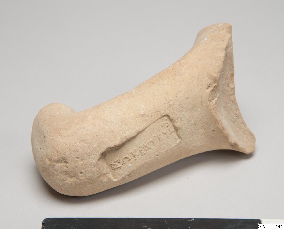 • Oval, perpendicular handle from an amphora. Greek letters in relief. Hard, pinkish buff clay. Matt, buff slip.