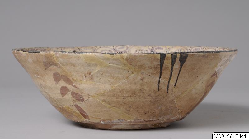 Flaring sides, straight rim, low unglazed foot. Pale reddish paste, pale yellowish white slip, blackish brown and pale red slip-painting under transparent glaze. Exterior, intersecting succession of pale red leafs and groups of three blackish brown lines from rim and down. Interior, Central medallion outlined in blackish brown. Concentric band in pale red, showing simulated kufic or simplified creatures, inscriptional band, succession of loops intersected with circles on dotted ground.