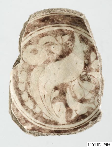 Probably the fragment of a bellshaped bowl, only parts of the central medallion left. Stonepaste, pinkish white, covered with opaque turquoise toned white glaze decorated with brown lusterpaint. The central medallion within a white circle shows a big foliate and floral motid in reserve.