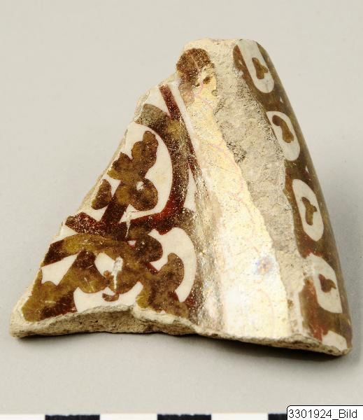• Rim-sherd of glazed pottery. Interior: Brown, slightly reddish decoration on white background. Exterior: Band encircling below rim. Pale clay.