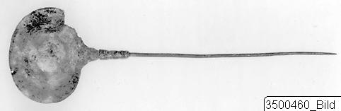 Cast and hammered. Plain shank with oval plate head, large flat central omphalos, incised geometric design. Decor: outer ring of dots, then ring of dotted triangles, hanging from a line, then remnants of dotted simple guilloche, remnants of herringbone band, finally running arches? around omphalos.